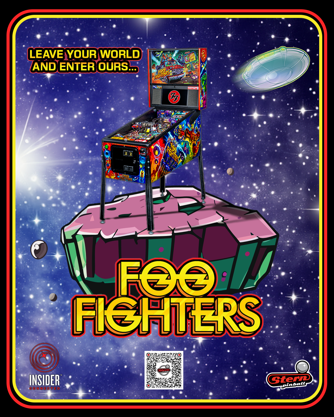 Ad poster for Stern Pinball’s Foo Fighters Pinball Machine for use in Stern’s external marketing efforts with third party distributors.